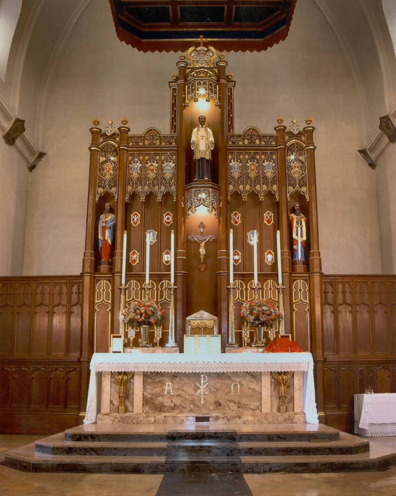 This rectangular-shaped frontal covers the entire front of the altar as a vestment and is usually the color of the Mass being celebrated. In addition, to signifying the dignity of the altar, the antependium also lends a colorful focus to the altar and thereby the Mass actions. The antependium can be hung either from a rod under the front edge of the altar or attached to one of the altar cloths. Some antependiums are actually permanently fixed to a wooden or metal frame and then secured to the front of the altar, as is done on the high altar at St. Peter’s Basilica. In cases where there is a gap between the mensa’s edge and the antependium, because its suspended from a rod a few inches below the altar’s front edge, another smaller antependium is used called a “superfrontal”, from the Latin, “above the frontal”.